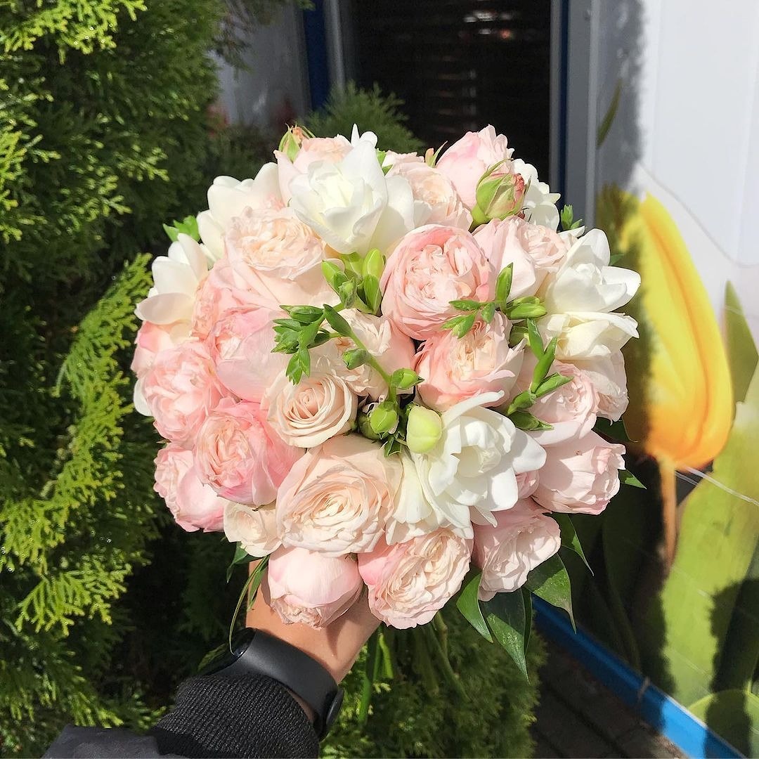 - Нежная кустовая пионовидная кустовая роза и фрезия имеет идеальное сочетание.