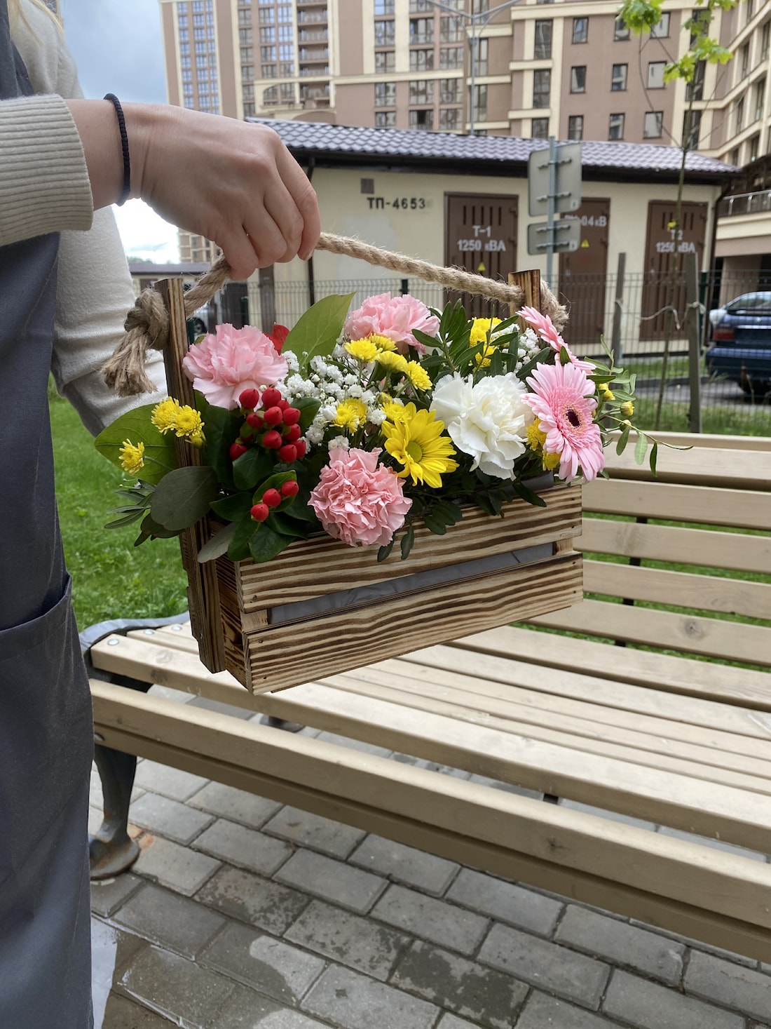 Цветы в деревянной коробке-ящике "Желание" доставка букетов цветов в Москве Цена 4800 руб