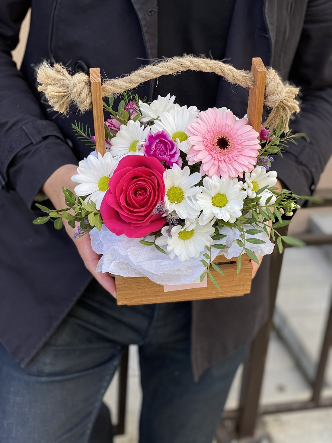 Цветы в деревянной коробке-ящике " Московский Восторг" доставка букетов цветов в Москве Цена 2200 руб