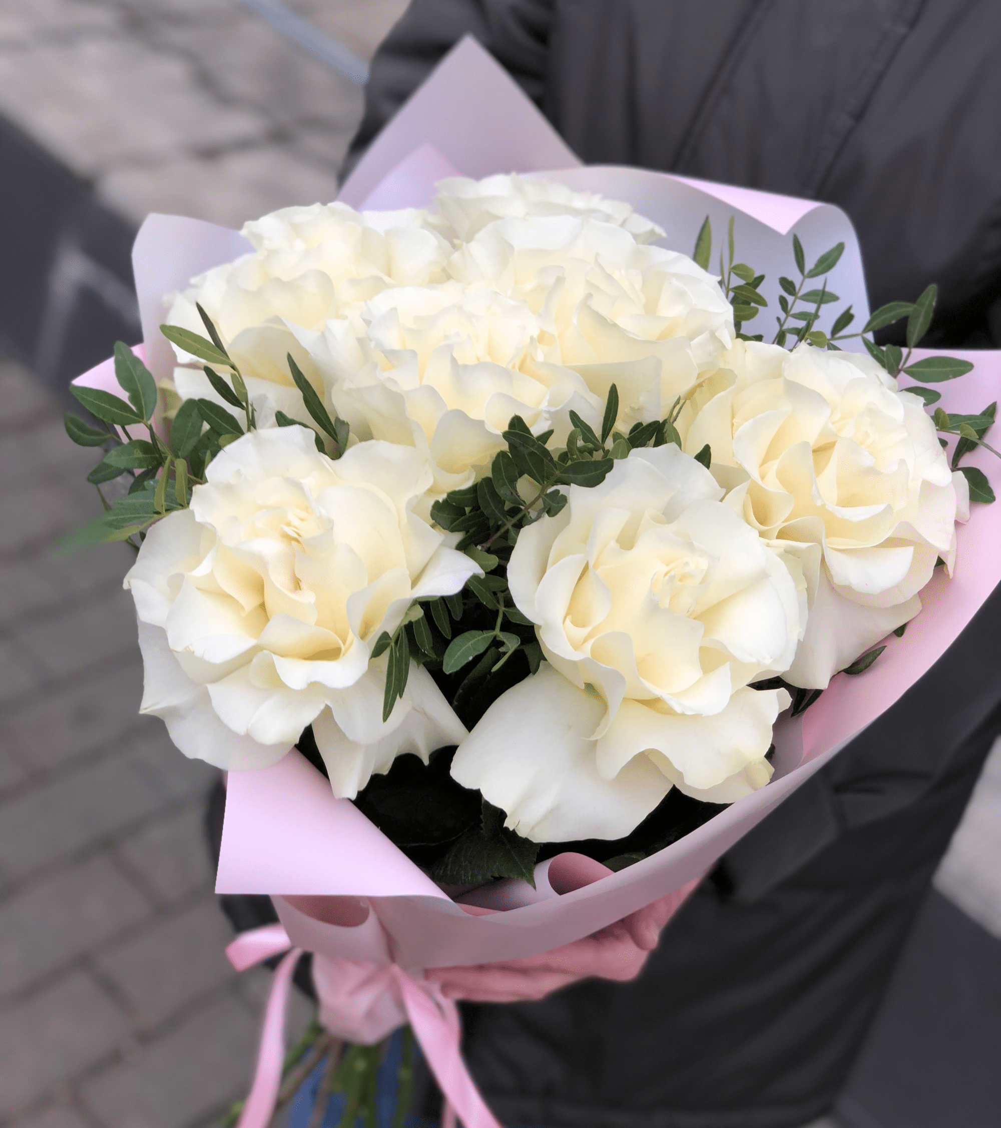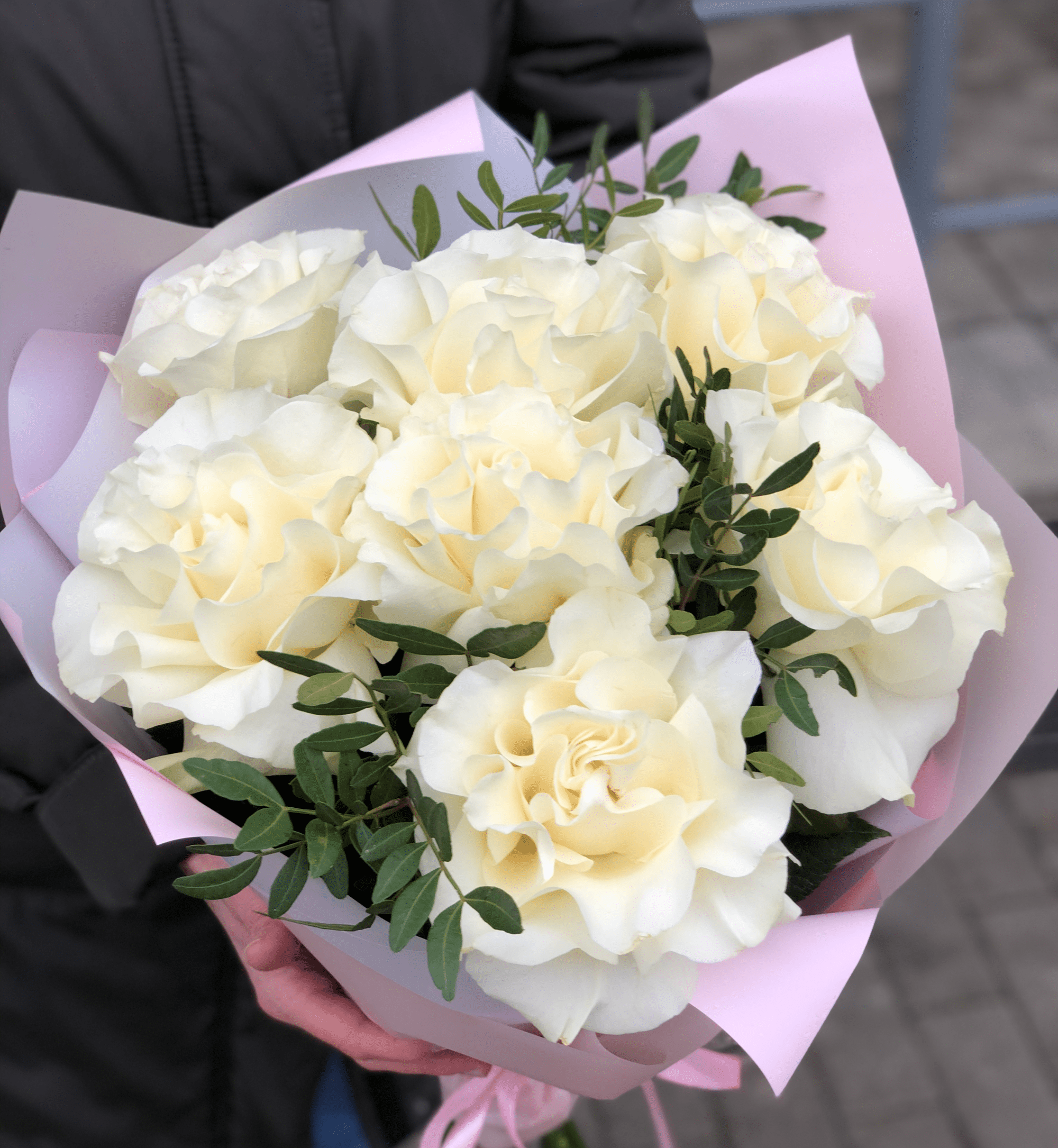 Наш абсолютный хит продаж - это "Merci Москва" из семи французских роз. Белоснежные, пышные розы идеально смотрятся в монобукете. Добавляем чуточку зелени и получаем невероятную магию!