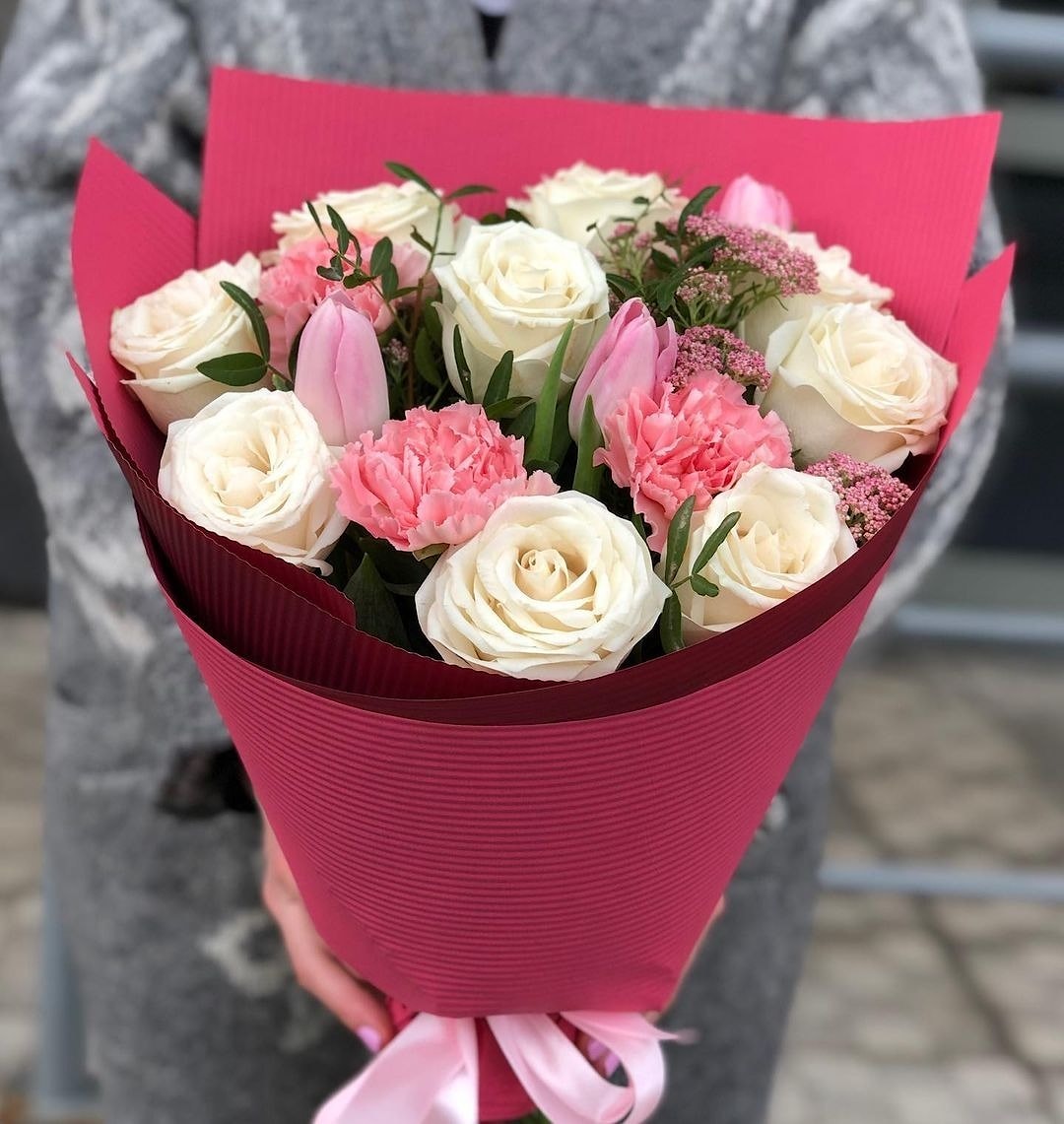 Состав: Букет из Белой Розы, Тюльпан, Гвоздики и Экзотики в Москве.
