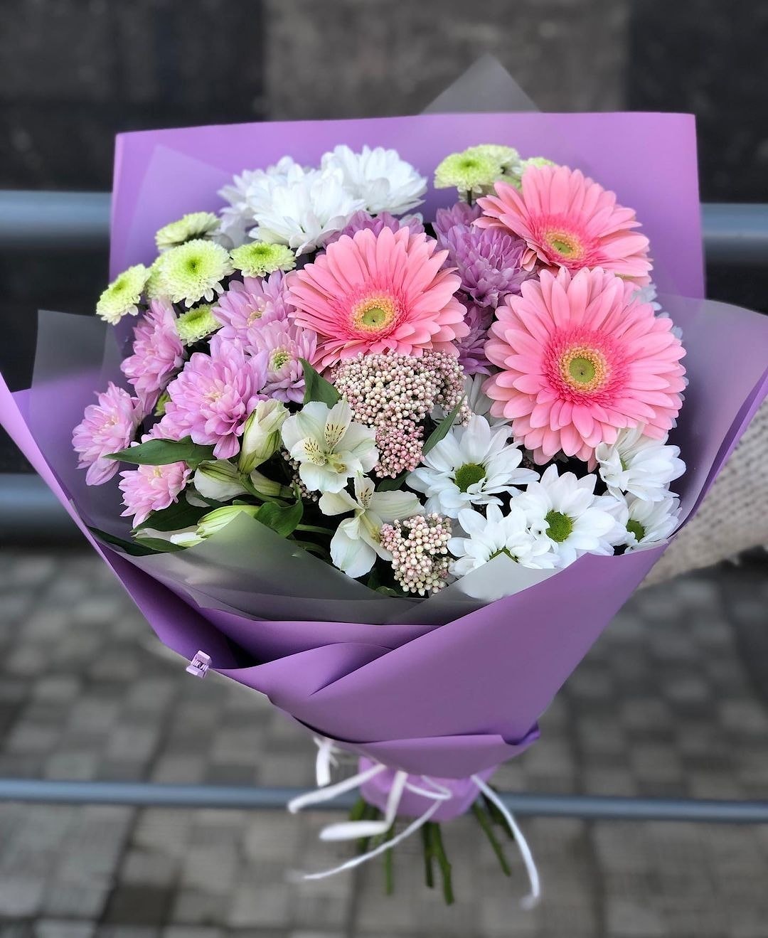 Состав Букета №41 "Букет в Московском Стиле"- хризантема, гербера, озотамнус, альстромерия