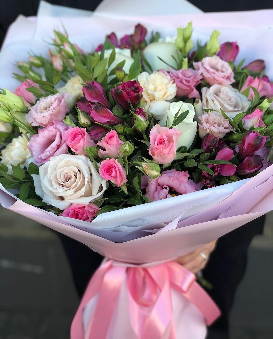 Состав: роза, кустовая роза, альстромерия, эустома, зелень, гвоздика.
