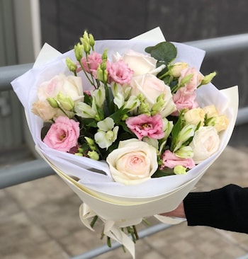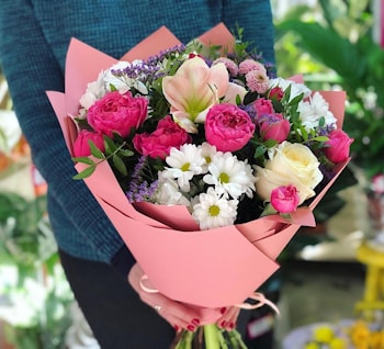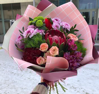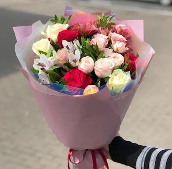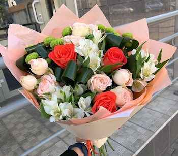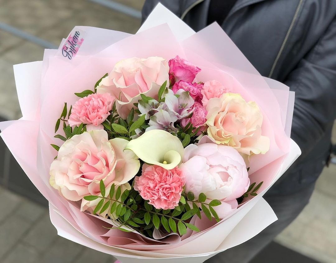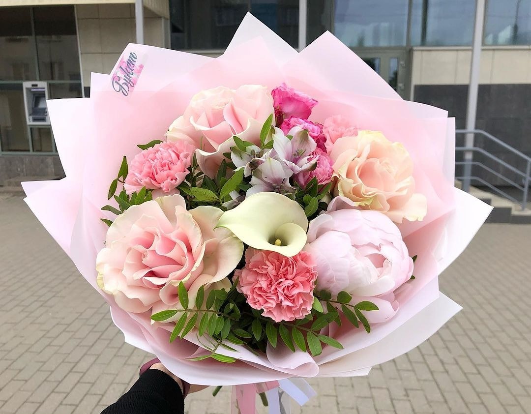 Состав: французская роза, пион, калла, альстромерия, гвоздика, кустовая роза, зелень.