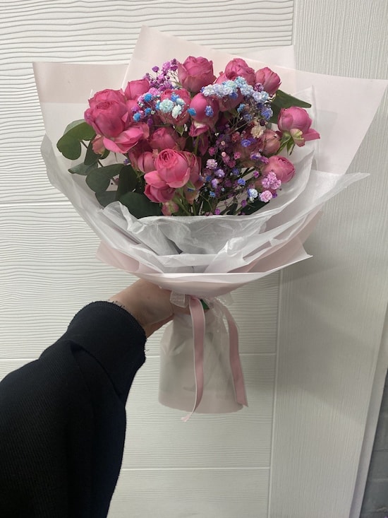 Состав: эвкалипт 2 штуки, гипсофила 1 штука, кустовая роза 5 штук, упаковка